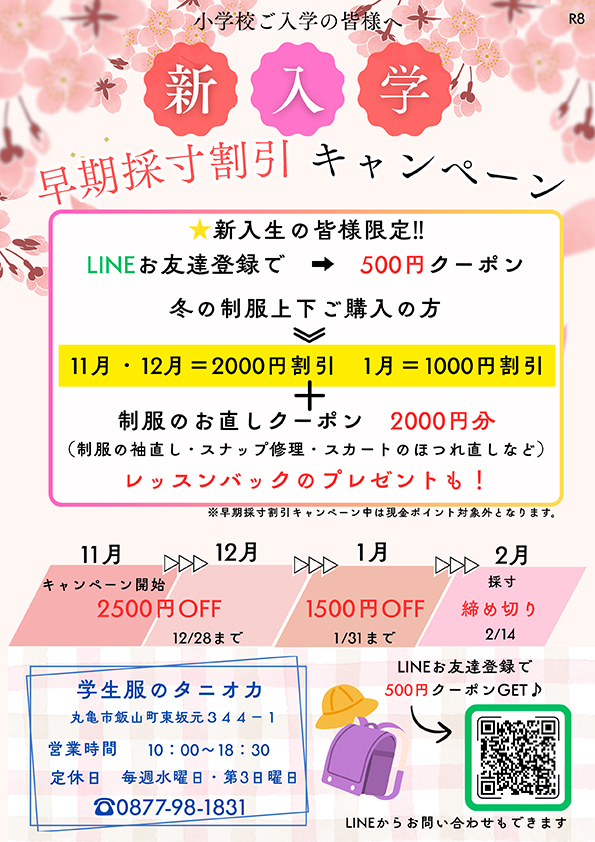 2026年度小学校新入学生への早期採寸割引キャンペーンを行います!