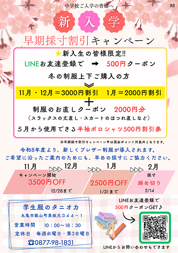 2026年度中学校新入学生への早期採寸割引キャンペーンを行います!